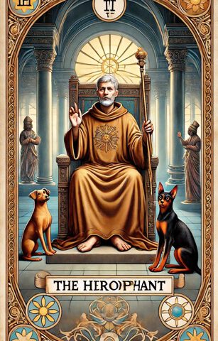 Der „Hierophant“ (V) ist die Folgekarte des „Herrschers“ (IV). Doch während wir beim „Herrscher“ aufgefordert sind, für Struktur und Ordnung zu sorgen, geht es beim „Hierophanten“ darum, die Kontrolle wieder aufzugeben und sich dem Sinn des Lebens zu zuzuwenden. Die Zahl Fünf, die auch der „Hierophant“ trägt, wird aus der Sicht der Numerologie als Zahl des Ungleichgewichts bzw. als die „Zahl des Menschen“ bezeichnet und ist in diesem Zusammenhang nicht immer einfach zu verstehen.